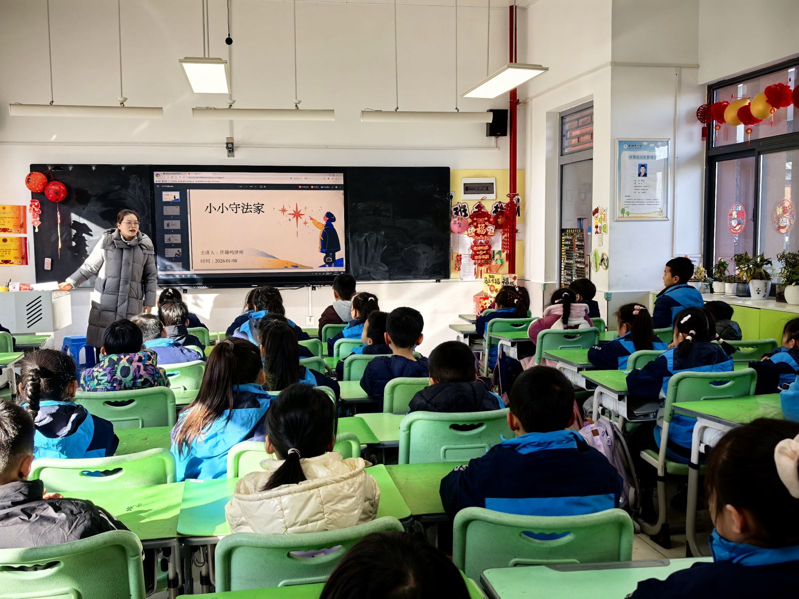 为深入贯彻中小学法治教育相关要求,将法律知识普及与学生成长需求紧密结合,2026年1月8日上午,我所许璐鸣律师受邀走进周至县新区小学,为该校小学生带来一场生动有趣的公益普法课堂——《小小守法家》,让法治种子在孩子们心中生根发芽。